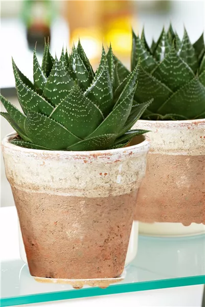 Die über 300 Arten der Aloe (Aloe) haben sich darauf spezialisiert, auch bei extremen Klimabedingungen zu überleben. Gießen Sie die Pflanze sehr sparsam, der Boden darf auch leicht austrocknen. An einem warmen und sonnigen Standort, auch mit direkter Sonneneinstrahlung, kommt die Pflanze gut zurecht und darf im Sommer gerne auf Ihren Balkon oder die Terrasse umziehen.